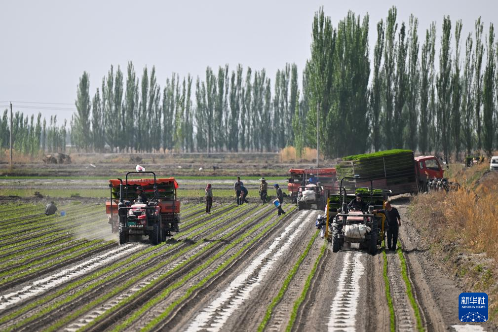 正在新疆巴音郭楞蒙古自治州博湖县本布图镇,农户把辣椒苗放到传送带上,夹苗安拆从动移栽(4月29日摄)。