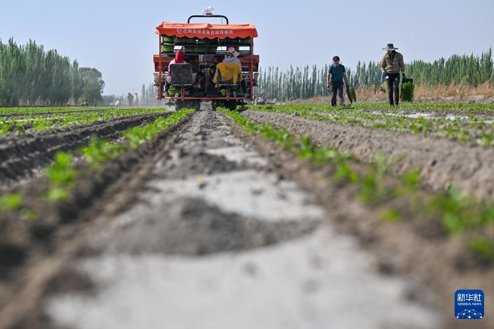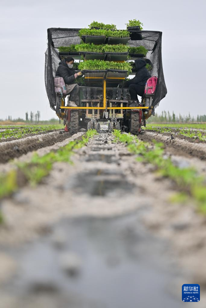 正在新疆巴音郭楞蒙古自治州博湖县本布图镇,农户把辣椒苗放到传送带上,夹苗安拆从动移栽(4月29日摄)。