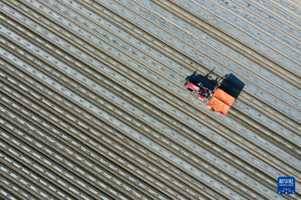 正在新疆巴音郭楞蒙古自治州博湖县本布图镇,农户操做移栽机移栽辣椒苗(4月28日摄,无人机照片)。